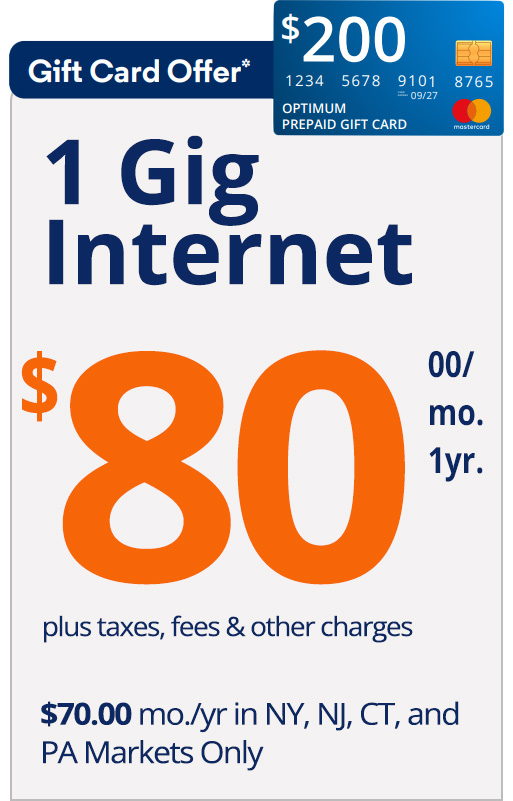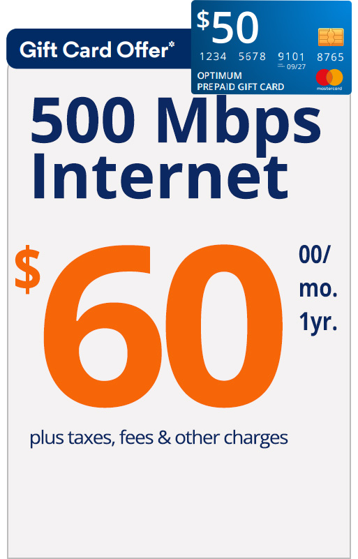 *PREPAID MASTERCARD: Offer is not available to individuals who have previously participated in a prepaid/gift card or Snappy Gift promotion within the past 12 months. Must maintain promotion and remain in good standing with no past due or returned payments throughout first 90 days after account activation in order to receive prepaid card. Card will be mailed 4-6 weeks after 90-day period or customer may elect to receive virtually. Limit 1 per customer. Prepaid Mastercard cannot be used to pay Optimum monthly bill. Card/virtual card is issued by Pathward®, N.A., Member FDIC, pursuant to license by Mastercard International Incorporated. Mastercard and the circles design are registered trademarks of Mastercard International Incorporated. No cash access or recurring payments. Card can be used where debit Mastercard is accepted. Virtual card can be used where debit Mastercard is accepted online, for phone/mail orders or in stores that accept mobile wallet. Card/virtual card valid for up to 12 months; unused funds will forfeit after the valid thru date. Terms and conditions apply.